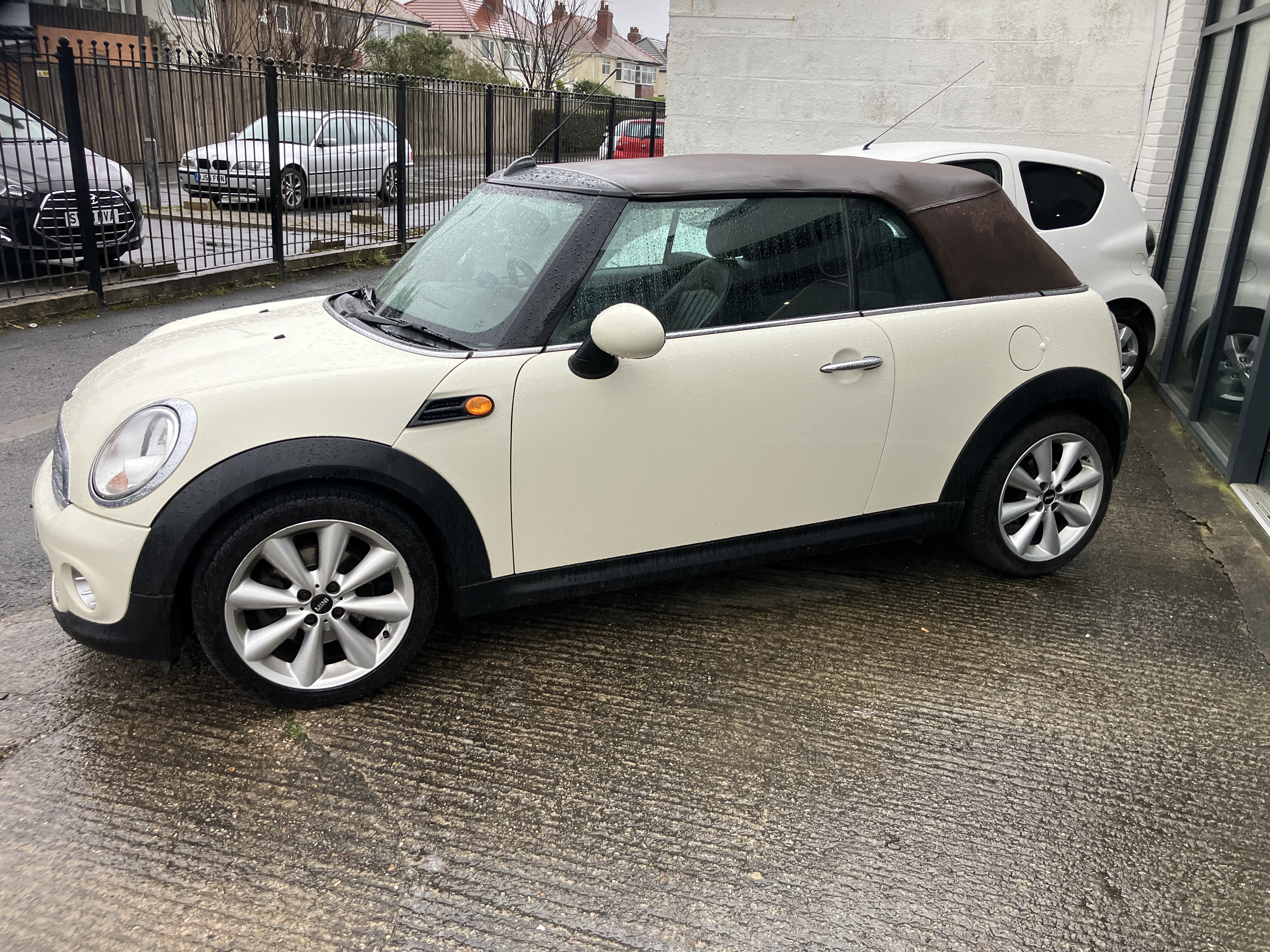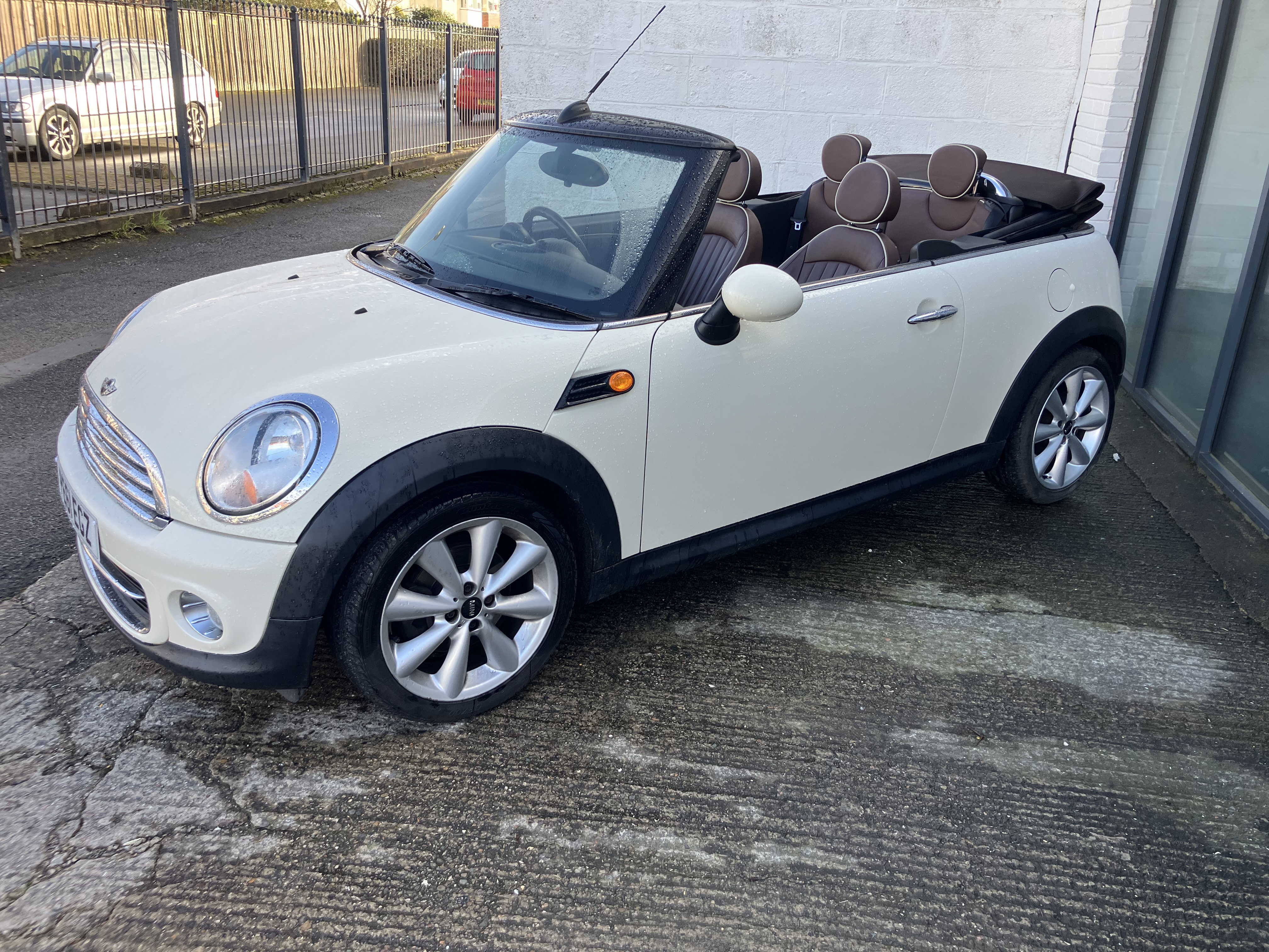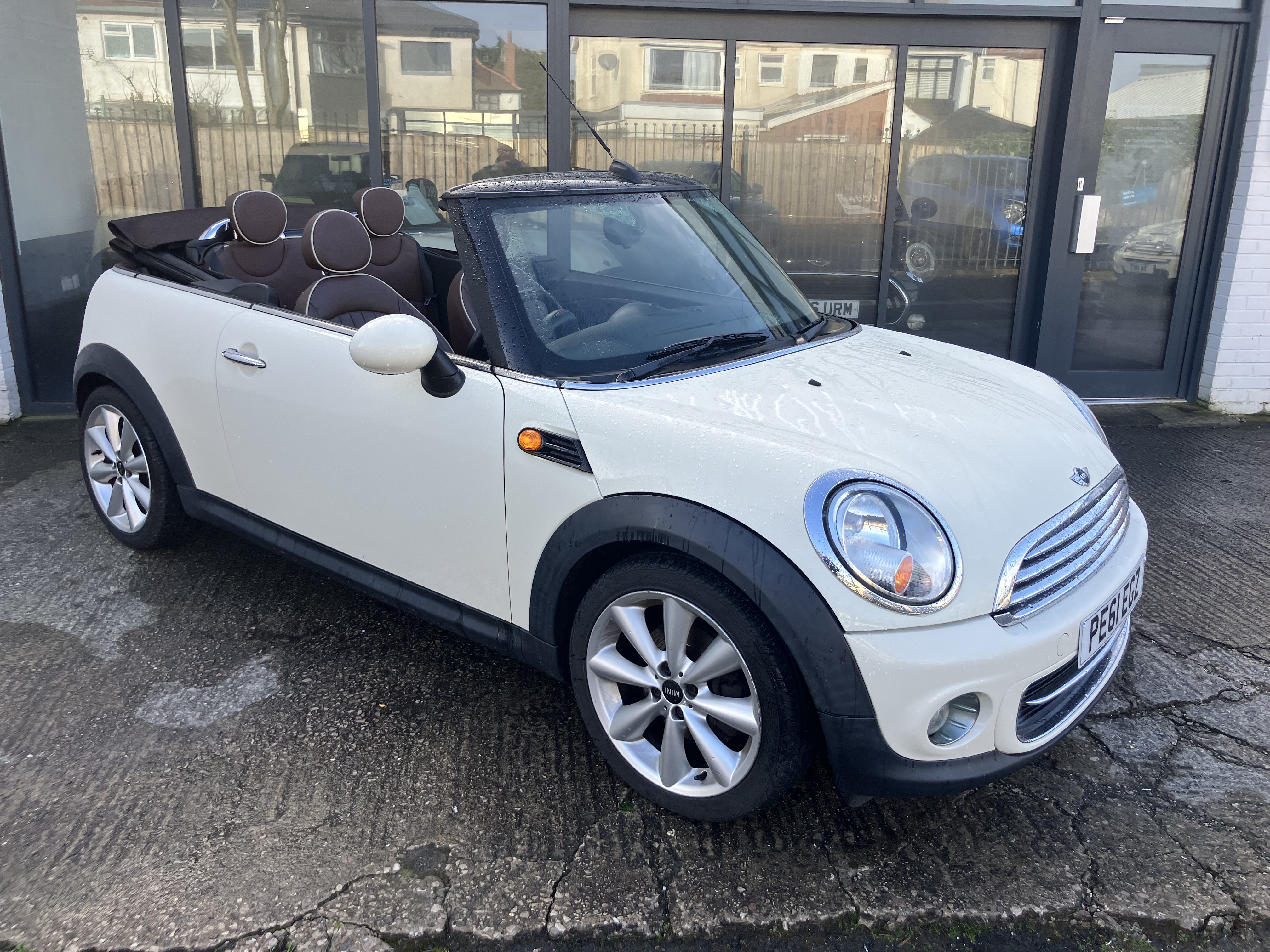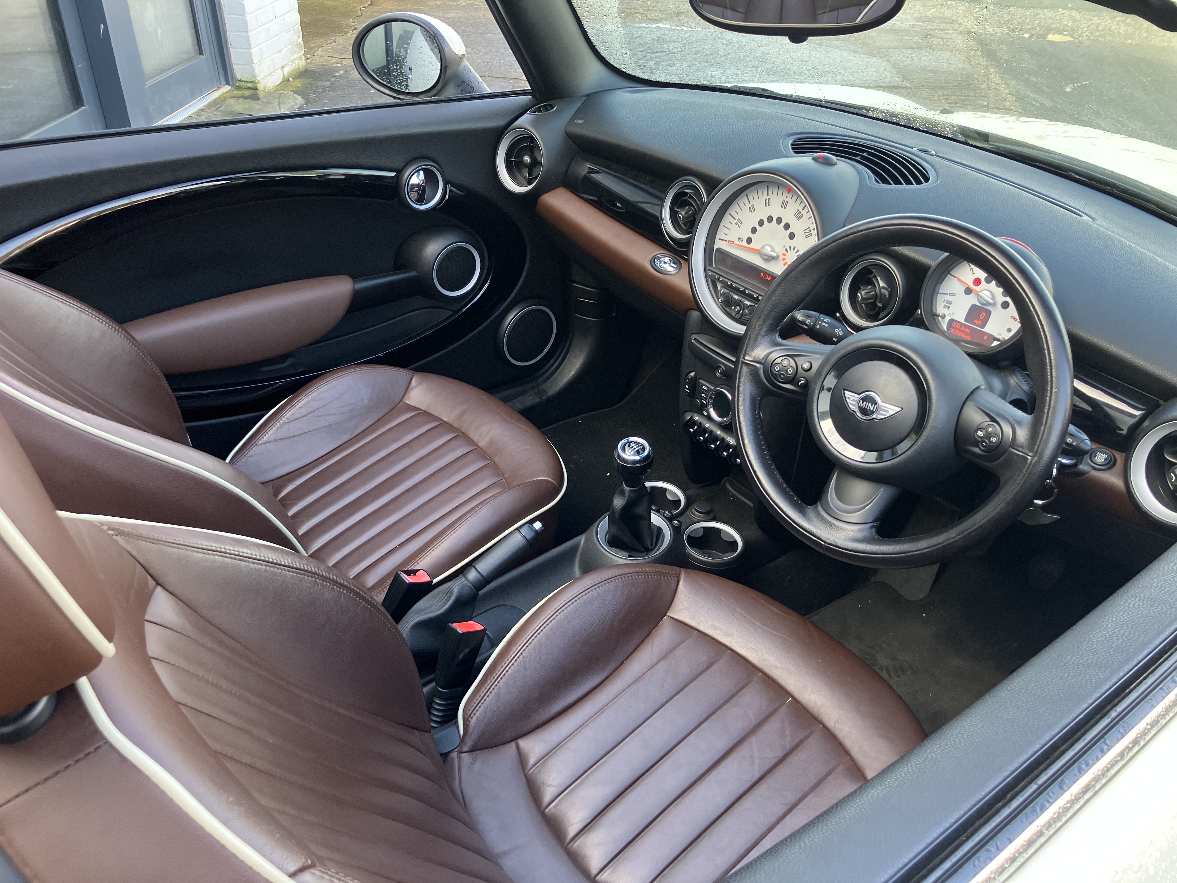 MINI CONVERTIBLE JUST IN TIME FOR SUMMER - REALY NICE COLOUR COMBINATION PEPPER WHITE WITH HOT CHOCOLATE LOUNGE LEATHER AND CHOCOLATE ROOF - REALY GOOD SPEC WITH 16" TWIN SPOKE 6- STAR ALLOYS AND REAR PARKING SENSORS - FULL SERVICE HISTORY - SERVICE AND MOT JUST DONE - 2 KEYS AND ALL HAND BOOKS